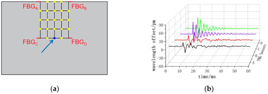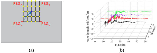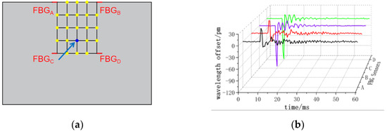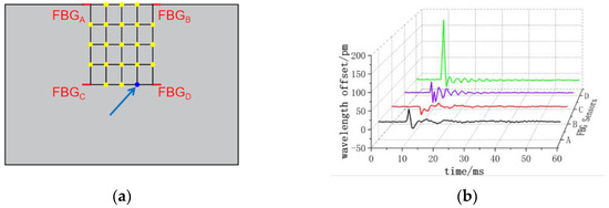 In recent years, there has been a growing interest in the application of sensors for structural health monitoring and early prediction. Numerous scholars have conducted extensive research on the localization of low-velocity impact damage in composite structures, proposing several meaningful localization methods, including the use of strain gauges [13], accelerometers [14], piezoelectric ceramic patches [15], and piezoelectric film sensors [16]. With the continuous development of fiber optic sensing technology, various key technologies have gradually matured and been applied in practice [17,18,19]. Fiber optic sensing technology is widely regarded as a very promising technology. Among them, FBG sensors have attracted more attention in health monitoring due to their small size, high temperature resistance, electromagnetic interference resistance, and ease of implementation [20,21,22,23].