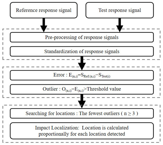 To determine the impact location, the error is calculated between the reference signal and the random test signal. Then, outliers are identified by comparing the error with a predefined threshold. Finally, the impact location is determined based on the outliers. The flowchart of the impact localization algorithm based on error outliers is presented in Figure 14.