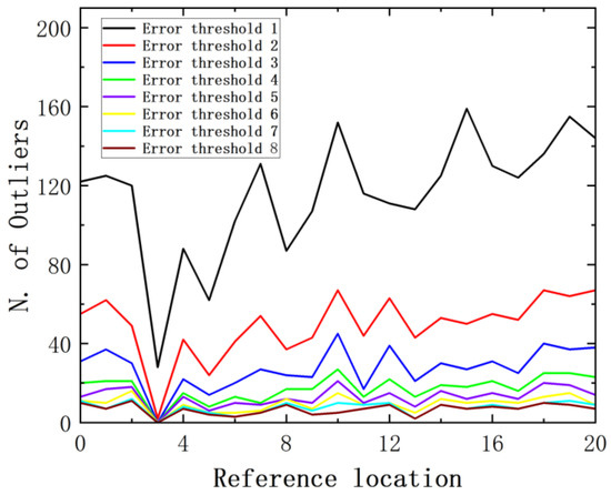 The number of outliers obtained at each reference location using different error thresholds is presented in Figure 15. It is evident that the number of outliers is highly sensitive to the selected error threshold. Lower thresholds result in more outliers, while higher thresholds lead to fewer outliers.