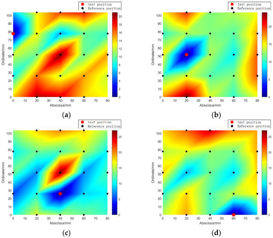 Overall, four random cases were chosen for model testing. The total sum of error outliers for FBGA–D was visualized using a color map, illustrating the number of outliers at each reference point in the specimen, as shown in Figure 16. The color map ranges from dark blue to dark red, with dark blue indicating a small number of outliers and dark red indicating a large number of outliers. Locations closer to the actual impact location are represented by colors closer to dark blue.