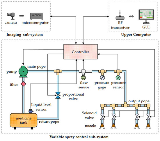 Currently, in the field of agricultural plant protection variable spray technology, the mainstream variable spray technology mainly includes pressure regulation, concentration regulation, and PWM regulation. In contrast, the pressure control type has a small flow adjustment range, easy distortion of spray characteristics, and the response speed of the concentration control type system is slow, which cannot meet the needs of real-time precision spraying, while the PWM control type system adjusts the spray flow of the nozzle by changing the operating frequency and duty cycle of the solenoid valve. It has the advantages of good dynamic characteristics, high control accuracy, fast system response, and a large flow adjustment range [27]. Therefore, this study decided to adopt PWM-regulated variable spray technology. The variable weeding control system designed in this study is composed of three subsystems, namely, the imaging subsystem, remote host computer, and variable spraying control subsystem. The specific structure of the system is shown in Figure 1.