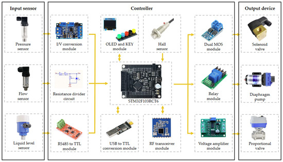 The variable spraying controller is designed based on a microcontroller (STM32F103RCT6, ST Microelectronics, Geneva, Switzerland) and the electronic hardware design scheme of the controller is shown in Figure 2. The output signal of the pressure sensor is a 4~20 ma current signal, which is converted into a 0~3.3 V voltage signal using an I/V converter circuit, and the microcontroller then reads the water pressure signal through an ADC converter. The microcontroller reads the pulse through the input capture function to achieve real-time detection of the spraying flow rate. The flow sensor output signal is a 24 V square wave pulse signal, and the accumulated 8500 pulses are equal to the flow rate of 1 L using the resistance divider circuit to convert the 24 V pulse signal to a 3.3 V pulse signal. The level sensor based on ultrasonic technology adopts the RS485 communication method, and the communication protocol is based on the Modbus protocol. The microcontroller reads the level information of the tank through TTL to the RS485 module (MAX3487, Analog Devices, Norwood, MA, USA). The microcontroller calculates the real-time traveling speed of the UGV by capturing the pulse output from the Hall sensor (JK8002D, JCXD, Nanjing, China) and adding them up, and the response frequency of this sensor is 100 KHZ. The microcomputer collects the real-time distribution of vegetation with the use of the camera and then relies on the algorithm to analyze the data in-depth and generate the corresponding intelligent decision making, and finally sends the decision-making data to the microcomputer through the USB to the TTL converter module. Finally, the decision data are sent to the controller through the USB to the TTL conversion module to achieve automated management. The RF-based wireless transceiver module (A7139, AMICCOM, Taiwan, China) is used for remote communication between the host computer and the controller, and sends the flow, pressure, liquid level, and operation status collected by the microcontroller to the host computer. A7139 is a wireless transceiver chip in the ISM band, with a maximum output power of up to 20 dBm, a maximum transmission rate of 250 Kbps, and a communication distance of up to more than 1 km in the open field. The communication distance in open space is up to more than 1 km, and there will be no network delay similar to that of a 4 G module, which is very suitable for the field of intelligent agriculture. The solenoid valve control circuit is a drive circuit using dual MOS tubes (AOD4180, AOS, San Francisco, CA, USA) in parallel. The advantages of MOS tubes include fast switching speed, lower power consumption, and strong anti-interference, and the dual MOS tube drive scheme can pass a larger current, which can improve the stability of the relay control circuit. The controller amplifies the 0~3.3 V signal output from the microcontroller DAC into 0~10 V signal through the voltage amplification module. Then, after being connected by the RVVP shielded cable, it is finally used to control the opening and closing degree of the proportional valve. The diaphragm pump starts and stops instantly and generates a large current, so it adopts a high-power relay module, and the principle is that the microcontroller achieves the control of the diaphragm pump by controlling the relay. The OLED screen (Blue-1.3 Inch, RISYM, Shenzhen, China) displays the system’s current spraying-related information in real time, and the KEY module can control the system’s starting and stopping, which both increases the convenience of debugging the system in practical use. Both add to the ease of commissioning the system in practice.