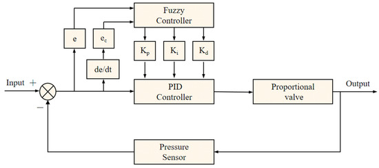 The adaptive fuzzy PID algorithm is an advanced control algorithm, which is mainly composed of a fuzzy controller and a PID controller. The structural design of the algorithm is shown in Figure 3. The core concept of the algorithm is to make full use of the advantages of the fuzzy controller and PID controller to realize the precise control of the water pressure of the output pipe [29].