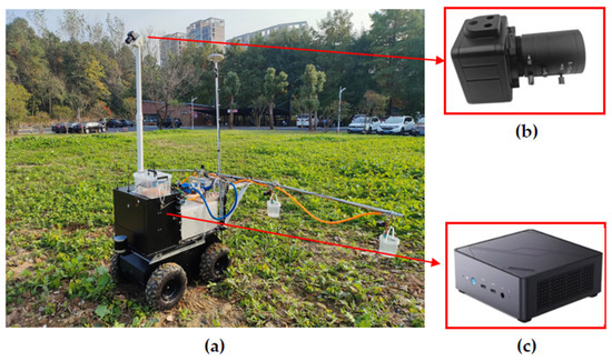 In the field test, this study set the traveling speed of the UGV to 1 m/s. The distance from the camera to the nozzle is 1.2 m, which means that the system needs to strictly control the response time within 1.2 s from the beginning of image acquisition to the completion of variable spraying. This response process consists of five steps: reading the image, saving the image, processing the image, transmitting the data, and controlling the spraying. The mapping length of the image in the field has a decisive influence on the acquisition frequency of the system. To indirectly control the acquisition frequency of the system, the camera is adjusted by changing the angle of the camera mounted in front of the UGV. To minimize the proportional distortion of the images, the length of the acquired images was set in this study to be the image at a distance of 1~3 m from the farmland in front of the UGV, which resulted in an image acquisition interval of 2 s for the system. The evaluation UGV is shown in Figure 13.