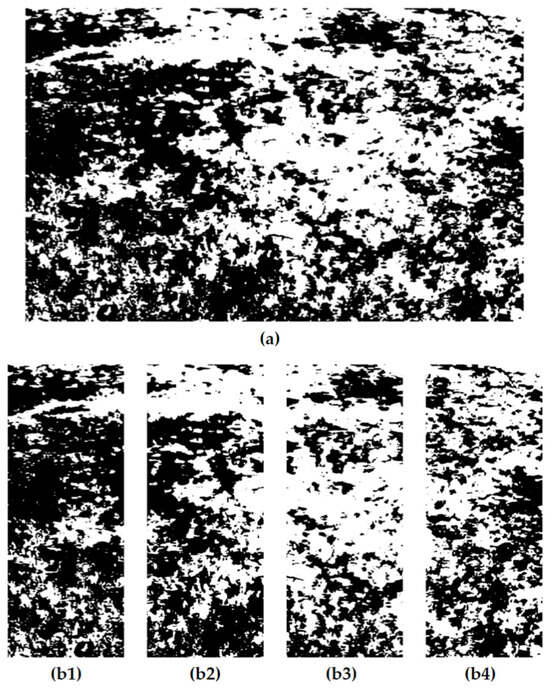 After the above steps, the imaging subsystem has successfully segmented the image into two regions, the target, and the background, and the final processing of the image using the vegetation distribution evaluation algorithm is still required. Firstly, the image segmentation algorithm will divide the vegetation image uniformly into four small farm images, each of which corresponds to a specific nozzle operation plot in the field, as shown in Figure 6.