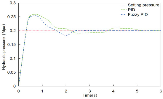 In this experiment, to record the real-time water pressure changes of the system, a set of test upper computer software (PyCharm Community Edition 2023.2) based on the tkinter GUI library were developed. The software establishes a full-duplex communication mode with the system via a USB cable to ensure real-time and efficient data transmission. The upper computer can receive and display the water pressure data of the system in real time, and can graphically display the real-time changes in water pressure, providing researchers with an intuitive basis for data analysis. Before the start of the test, the tester set the control water pressure of the variable spraying system to 0.2 MPA, and tested the changes in the waveform of the start-up water pressure of the system under traditional PID control and adaptive fuzzy PID control, respectively. The results are shown in the accompanying Figure 7, which demonstrates the difference between the two. The test data show that the adaptive fuzzy PID control algorithm regulates the water pressure faster and the relative control accuracy is higher compared to the traditional PID control algorithm. In variable spraying scenarios, the control system’s adjustment speed and control accuracy of water pressure are crucial because the spraying amount needs to be adjusted frequently to adapt to the distribution of different vegetation. The adaptive fuzzy PID control algorithm is more suited for use in changeable spraying scenarios because it can better adjust to this demand and allow the spraying system to run steadily under these conditions.