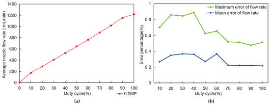 With the spraying data obtained from the above tests, this paper then investigates the spraying stability of the variable spraying data. The results of the data analysis are shown in Figure 9b. The test results show that under all possible PWM duty cycle controls, the average error of variable spray for all nozzles is less than 0.5%, and the maximum error of variable spray for all nozzles is less than 1%. The test proved that this variable spray system has a very high accuracy when only a single nozzle is adjusted.