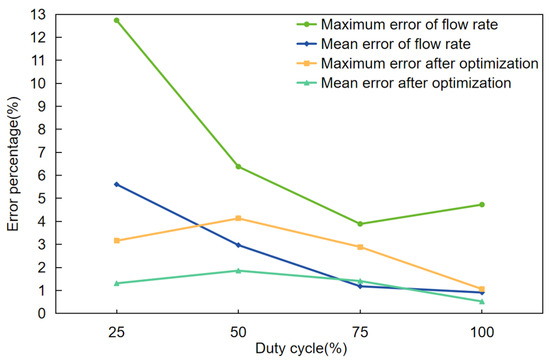 Finally, based on the above experiments, this paper adjusted and optimized the spraying control system strategy, which effectively reduces the impact of the control sequence between the nozzles, and real-time monitoring of the spraying flow condition through the algorithm to achieve automatic adjustment of the control signal. The results show that the average error rate of the 25% duty cycle data after optimization is less than 2%, and the maximum error rate is less than 5%, as shown in Figure 10. This series of improvement measures can ensure that all nozzles can be combined in a way that meets the system performance requirements while minimizing errors, thus guaranteeing the stability and accuracy of the system.