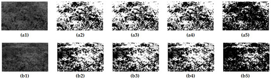The image after threshold segmentation: (a1) gray image; (a2) OTSU; (a3) K-means; (a4) FIT; (a5) HBT; (b1) gray image; (b2) OTSU; (b3) K-means; (b4) FIT; (b5) HBT.