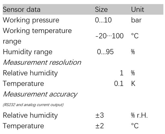The LubCosH20II sensor (ARGO HYTOS, Karlsruhe, Germany) was applied for monitoring in this research. The sensing part was composed of a metal grid printed on a circuit board and two platinum metal wires without direct contact. Based on the measured electrical signal and the built-in circuit processing and conversion device, data transmission and exchange were performed directly with external equipment through a cable. The sensor detected the following physical characteristics of oil and their changes over time: temperature, relative oil humidity or relative dielectric constant (relative permittivity) and electrical conductivity of fluid. Since electrical conductivity and relative permittivity were strongly affected by temperature, the sensor also defined the values at a reference temperature (40 °C) in addition to characteristic values at the measurement temperature. The sensor automatically evaluated state changes. The structure and parameters of the LubCosH20II sensor are illustrated in Figure 2 and Figure 3.