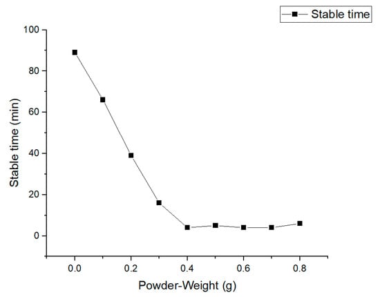 It was seen from the obtained results that with the increase in the amount of catalyst iron acetylacetonate (accelerator), the stabilization speed of the curve showed a gradually accelerating trend. After the addition of 0.4 g catalyst, although there was still a slight speed change, the difference was small and could be ignored. Therefore, we selected 0.3 g as the optimal catalyst amount.