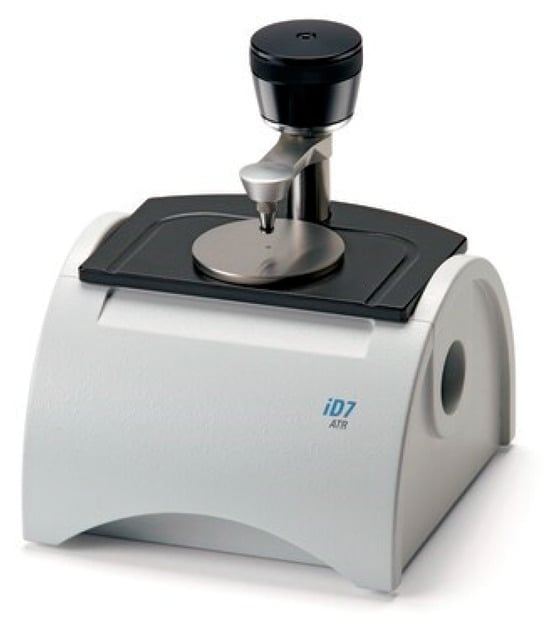 It is known that there is a good positive correlation between the dielectric constant and AN in engine oil []. In order to better verify the relationship between water content and AN, mid-infrared spectroscopy was applied to determine the AN of the prepared oil samples. The reference standard method ASTM E2412 was adopted for measuring total AN by infrared spectroscopy. The infrared spectra of oil products were collected using a Fourier transform infrared spectrometer and attenuated total reflection accessories, using the collection and analysis software OMNIC developed by Nicolet. Figure 14 shows the ATR accessories used for infrared spectroscopy monitoring