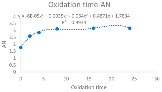 Using the area method to characterize the ANs of the six groups of oil samples, the relationship between AN and oxidation time could be obtained, and is shown as Figure 16.