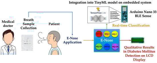 Hence, utilizing e-noses for exhaled human breath analysis and integrating machine learning for diabetes detection present certain limitations [35]. Integrating new breath samples into a trained algorithm requires a computer, analyzing differences between samples from sick and healthy individuals [44,51,52]. However, there is a solution to this limitation using TinyML, offering edge artificial intelligence (AI) capable of processing data locally, without the need for data transfer, preserving information, reducing latency, energy consumption, and enhancing data privacy/security [53,54,55,56].
