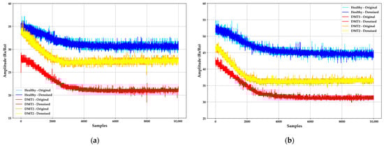 The decomposition level was determined based on Equation (6), which equaled 1, a significant value balancing signal integrity and noise sensitivity. The “db6” Daubechies 6 wavelet was chosen for its signal compression and noise elimination nature.