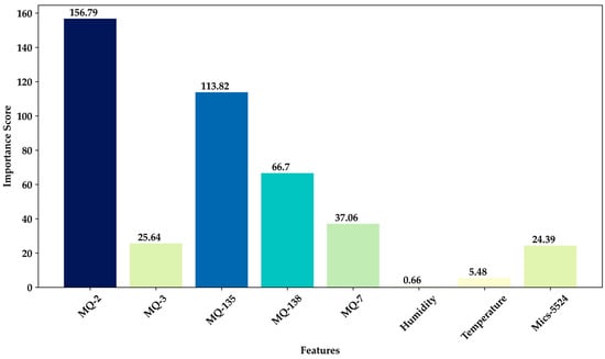 The univariate feature selection algorithm was implemented to refine the sensor features, aiming to enhance model precision while mitigating the risk of overfitting. This method evaluates the statistical relevance of each feature using a score function. The parameter “best features” was set to 4, indicating the desired number of features for selection. Subsequently, by extracting the indices of the selected features, specific sensor attributes that significantly contribute to the classification process were identified. Figure 7 illustrates the importance scores of the selected characteristics from each sensor. Notably, the measurements of acetone by the MQ-135 sensor and carbon monoxide by the MQ-2 sensor exhibited significant contributions. Consequently, only the top 4 selected characteristics from this process, including carbon monoxide, alcohol, acetone, and benzene, were utilized in the machine learning and deep learning models before training [44,46]. This feature selection process efficiently reduced the number of sensor attributes while retaining the most informative ones [35], thereby enhancing the performance and computational efficiency of our e-nose-based models post-training and conversion into TensorFlow Lite for the embedded system [53,55].