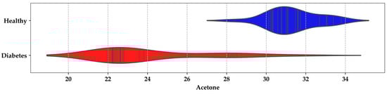 As part of the breath sample analysis, emphasis was placed on the acetone values in the Rs/Ro relationship between the HI and DMI groups; In Figure 8, a density range of 30–32, with a confidence interval of 28–30, was notable for the HI group, corresponding to BGL levels between 80.59 and 94.63 mg/dL. In contrast, for patients with T1DM or T2DM, the range was between 22 and 24, corresponding to BGL levels of 139.28–303.10 mg/dL. Based on measurements from the 44 participants, it was assumed that the exhaled-breath concentrations for an HI individual are <0.8 ppm, while for a DMI individual, they are ≥1.2 ppm.