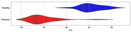 Furthermore, in Figure 9, a similar pattern is observed for the values of carbon monoxide in the exhaled breath among participant groups. A significant density range between 33 and 35 is noted for DMI, while a noticeable difference is observed for the HI group within the range of 44–47.