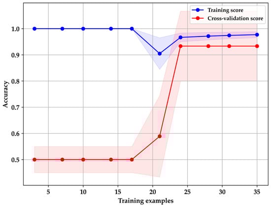 Following hyperparameter tuning, a learning curve was generated, as depicted in Figure 11, derived from the mean and standard deviation of model accuracy scores across each training and cross-validation fold. The classification report in Table 4 underscores the importance of recall values, particularly in the classification of HI patients. It highlights the model’s ability to correctly identify individuals with diabetes, minimizing false negatives, a crucial aspect for an early and precise detection approach, enabling timely medical interventions [16,35,36,50].