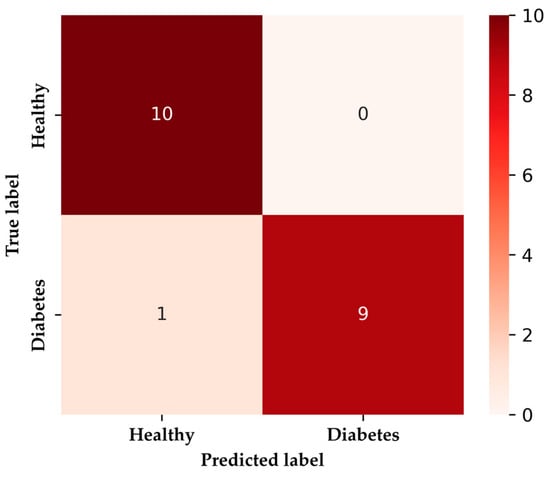 The XGBoost algorithm has demonstrated remarkable effectiveness in analyzing human breath to identify acetone biomarkers, showcasing its viability due to its high efficiency in handling missing data [48,50]. Its performance benefits further from parallelization and hardware optimization, setting it apart from other machine learning algorithms by being less impacted by feature scale differences [35]. Given the limited number of participants in the dataset, a 55% split for training and a 45% split for testing were employed. Using the selected number of features, a binary logistic classification model was trained. Hyperparameter tuning was carried out through grid search and a 5-fold cross-validation method, consistently demonstrating performance in line with similar studies. The best model achieved an accuracy of 95%. Table 3 provides details on the optimal hyperparameters obtained after training the data.