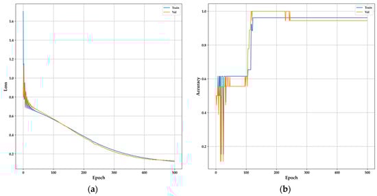 The model parameters include a fully connected layer architecture within a sequential model. The input layer comprises 20 neurons with the “ReLu” activation function, followed by a hidden layer with 1200 neurons using the same activation function. The output layer consists of one neuron for binary classification, employing the sigmoid activation function. A dropout value of 0.1 was applied between the layers to enhance model robustness. The compilation involves the “adam” optimizer, which has exhibited superior effectiveness in classification, as demonstrated in similar studies [44], and binary crossentropy loss. The model underwent training over 500 epochs to achieve optimal classification. Figure 13 displays the loss and accuracy metrics throughout the training process, showing balanced behavior between validation and training data after 200 epochs to prevent overfitting. An impressive accuracy of 94.44% was achieved with only four selected features from the sensors, demonstrating acceptable performance.