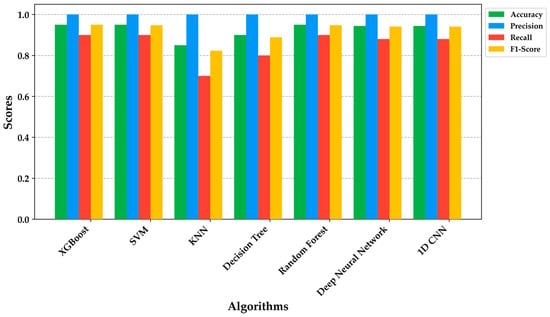 While XGBoost has emerged as the most suitable algorithm for this task [39,51,55], challenges were encountered in its conversion and compatibility with TensorFlow Lite, particularly when compared to other algorithms like SVM, KNN, and Random Forest. Nonetheless, DNN and 1D-CNN have proven effective, demonstrating favorable metrics in terms of precision and recall, showcasing their applicability in embedded systems [56,57,58].