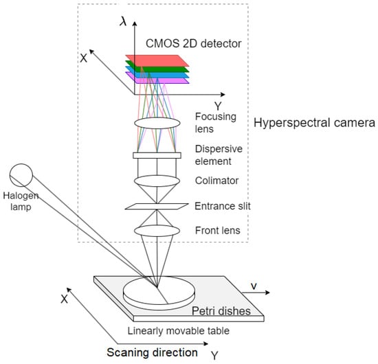 The initial step in HSI involves illuminating the target element with a light source that covers the spectral range of the hyperspectral camera. Halogen lamps are often used for this purpose due to their low cost compared to their high spectral power density. After the reflection from the sample, the light beam is collected by an objective and passes through the entrance slit. The slit is designed to only allow light from a narrow linear region to pass through. After collimation, the light is dispersed into a sequence of narrow spectral bands and is visualized on a CMOS matrix detector. The collected image represents a single line of the object as a function of its wavelength [].