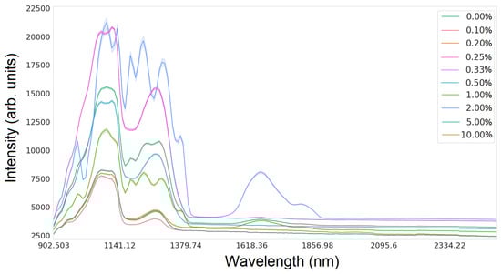 In hyperspectral imaging, the sample’s content can be studied based on the scattering, absorption, or rotation of the plane of the electromagnetic waves. The detection of particle concentrations through the scattering of rays in the near-infrared range is associated with challenges related to the precision and repeatability of measurement results. Factors like varied human body temperatures causing changes to the scattering of incoming radiation to the camera [] and intensity changes resulting from scattering are within the range of measurement noise [] and are a source of the noise.