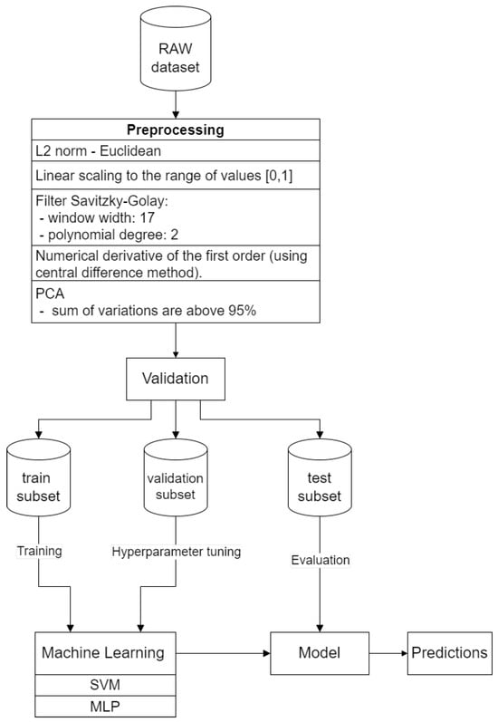 The whole dataset contains 94,730 samples of all glucose concentrations, and for silicon, there are a total of 47,375 samples. The obtained data were initially processed to classify their quality and explore the potential for predicting data based on them. The whole dataset’s hyperspectral data for all glucose concentrations is equal.