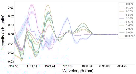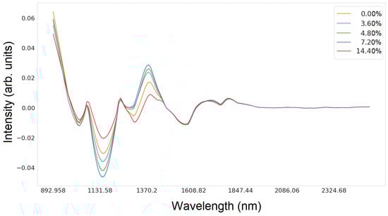A first-order numerical differentiation was applied using the central difference method for the data. Numerical differentiation of hyperspectral functions is particularly valuable when an analysis of the rates of change or the gradient of data variability is needed, which can facilitate new insights into fundamental trends or anomalies. However, due to the susceptibility to signal changes, it can amplify noise, leading to signal distortion. Therefore, it is advisable to apply a Savitzky–Golay filter in the preceding step to mitigate this effect []. Figure 5 and Figure 6 show the intensity distribution results of each wavelength after normalization and filtering. Figure 5 shows the results for glucose, and Figure 6 shows the results for silicon.