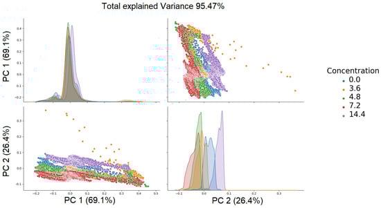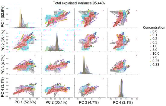 The color indicates the concentration of each component. Clustering of the data depending on the concentration of the components can be clearly seen.