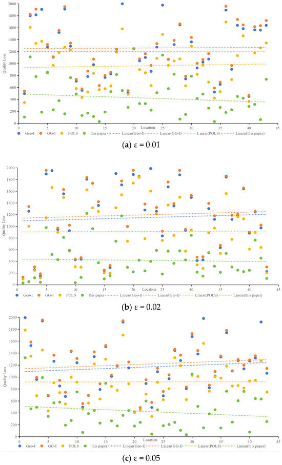 Quality loss, representing the deviation between protection effects and user needs, was analyzed concerning different privacy budgets (ε). Figure 9 compares quality loss for various algorithms at ε values of 0.01, 0.02, 0.05, and 0.1. Notably, accounting for semantic and temporal properties, the proposed method demonstrated consistently smaller quality loss for protected locations across all scenarios. When ε is 0.01, as shown in Figure 9a, the average quality loss of the proposed method is 65.1% lower than that of Geo-I, 66.6% lower than GG-I, and 56.2% lower than POLS. When ε is 0.02, as shown in Figure 9b, the average quality loss of the proposed method is 63.8% lower than that of Geo-I, 65.2% lower than GG-I, and 54.3% lower than POLS. When ε is 0.05, as shown in Figure 9c, the average quality loss of the proposed method is 63.8% lower than that of Geo-I, 65.2% lower than that of GG-I, and 54.0% lower than that of POLS. When ε is 0.1, as shown in Figure 9d, the average quality loss of the proposed method is 64.6% lower than that of Geo-I, 66.3% lower than that of GG-I, and 54.4% lower than that of POLS,.Whether ε is 0.01, 002, 0.05, or 0.1, Figure 9 illustrates that the proposed method has a minimal impact on service quality. In contrast, Geo-I, GG-I and POLS, which predominantly concentrate on location privacy without incorporating query content processing, result in poorer service quality. The impact of distance calculation on service quality varies, and the contributions of location semantics and temporal information to service quality are also elucidated.