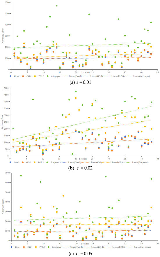Adversary error, indicative of privacy preservation, was assessed using the Location Privacy Meter [26]. Figure 10 showcases the adversary error for different algorithms at ε values of 0.01, 0.02, 0.05, and 0.1. The proposed method consistently demonstrated higher adversary error, implying a lower probability of user location identification. As ε increases, all methods exhibit decreasing adversary errors, with the proposed method maintaining a favorable position. When ε is 0.01, as shown in Figure 10a, the average adversary error of the proposed method is 2.3 times higher than that of Geo-I, 2.1% times higher than GG-I and 1.7 times higher than that of POLS. When ε is 0.02, as shown in Figure 10b, the average adversary error of the proposed method is 2.6 times higher than that of Geo-I, 2.6% times higher than that of GG-I, and 1.3 times higher than that of POLS. When ε is 0.05, as shown in Figure 10c, the average adversary error of the proposed method is 2.3 times higher than that of Geo-I, 2.3% times higher than that of GG-I, and 1.4 times higher than that of POLS. When ε is 0.1, as shown in Figure 10d, the average adversary error of the proposed method is 2.7 times higher than that of Geo-I, 2.6% times higher than that of GG-I, and 1.4 times higher than that of POLS. Whether ε is set to 0.01, 002, 0.05, or 0.1. Figure 10 highlights that the proposed method effectively misleads the adversary, posing a greater challenge in deducing the user’s actual location. In contrast, Geo-I solely focuses on distance, making it vulnerable to inference if the adversary possesses sufficient background knowledge about the protection mechanism. Although GG-I alters the distance-calculation method, it still shares the vulnerability observed in Geo-I. POLS incorporates factors such as location, semantics, and time; however, since each factor is considered independently, there is a higher likelihood that the adversary can deduce the true position compared to Geo-I and GG-I. Nevertheless, the proposed method in this paper outperforms POLS in terms of effectiveness.