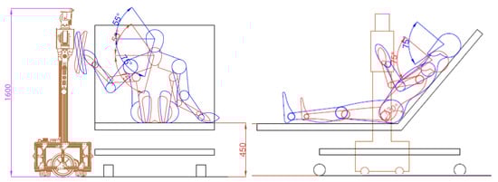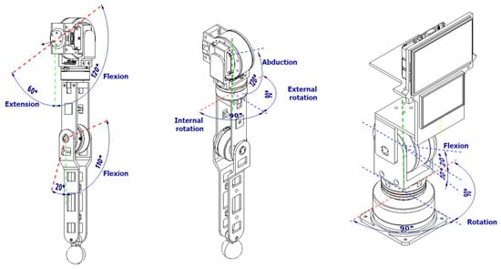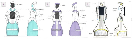 In this phase, the concepts developed during the ideation process were actualized. A detailed physical design of the robot was developed, incorporating features such as a screen to display facial expressions and articulated arms for precise movements. An ergonomic study was also conducted to determine the best location for the screen, microphones, and speakers, ensuring comfortable and effective patient interaction (see Figure 3). Special attention was paid to functionality, ensuring that the final design was practical and safe, as well as met all the previously identified requirements [].