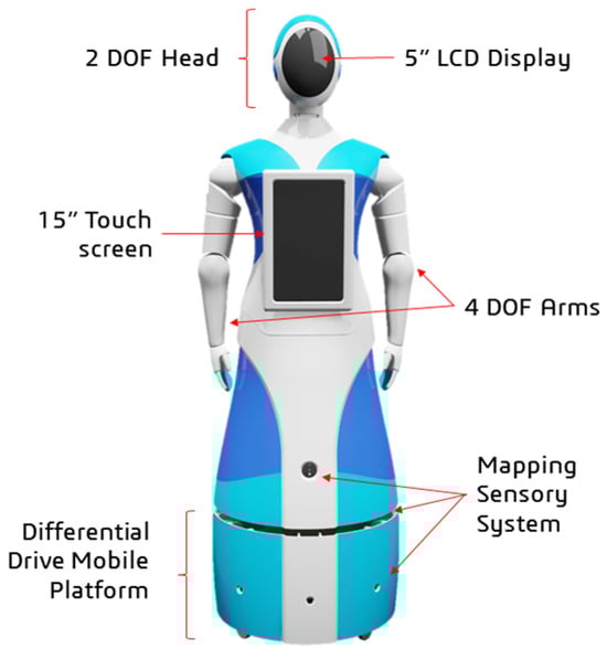 In this context, a social assistive robot (SAR) is used to assist by creating a close and effective interaction with a human user [,]. During the context of the COVID-19 pandemic, social interactions related to commerce, education, and health services had to be redesigned to maintain functionality without risking human health. In most cases, social robots were introduced as reliable alternatives to “the new normal” and its novel demands [,,].