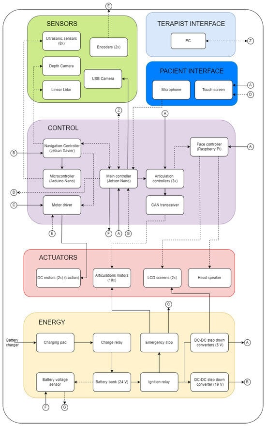 The mechatronic system of the robot is composed of sensors, actuators, control, energy, and interface elements. Figure 6 shows the hardware architecture with the links of all the main internal components.