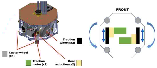 The robot is equipped with an automated movement system driven by wheels. Its traction system employs a differential distribution mechanism (see Figure 8).