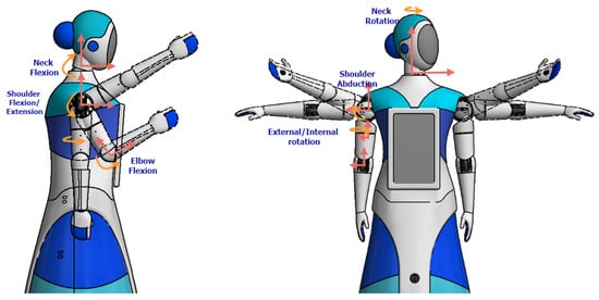 The Qhali humanoid robot features cognitive and ergonomic movements that help it express itself during its interactions with the patient. For this reason, it has two arms and an articulated head with two (02) screens to recreate facial expressions. A non-linear control scheme for trajectory tracking and a speed profile that executes the arm and head movements of the Qhali robot with natural motion was presented in []. Figure 10 shows the movements that the robot can perform with the arm and head joints it is equipped with. The arms have 4-DOF and the head 2-DOF, so they resemble the movements of a person.