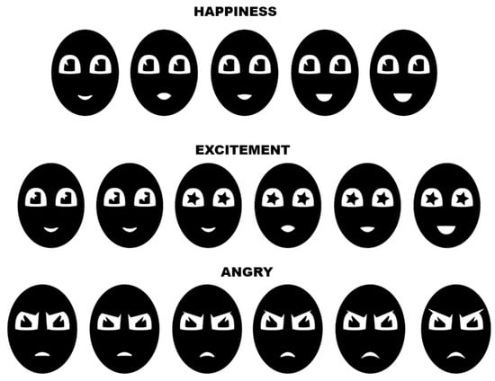 Incorporating anthropomorphism in robots demonstrates positive outcomes in mitigating anxiety, stress, and negative perceptions linked to human–robot interaction (HRI) [,]. Human communication significantly relies on non-verbal components that vary across cultures and ages. Standardizing these gestures for social robots, as proposed by [], is crucial. The user’s experience with social robots is shaped by humanoid shapes and movements as well as the presence or absence of facial expressions, impacting perceptions of trustworthiness. Striking a balance between facial anthropomorphic similarities and perceived naturality is essential, given humans’ tendency to attribute lifelike properties to machines. Subtle facial expressions, as discussed in [,], influence how people perceive the reliability and motivations of robots. Furthermore, the assumed gender of humanoid robots, as studied by [], plays a role in shaping attitudes during interactions.