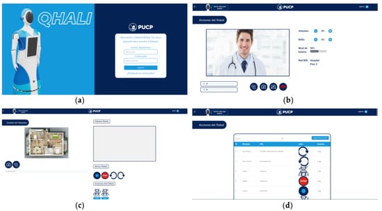 Teleoperation interface main screens: (a) access; (b) video conference and robot control; (c) remote teleoperation; and (d) configuration of robot actions.