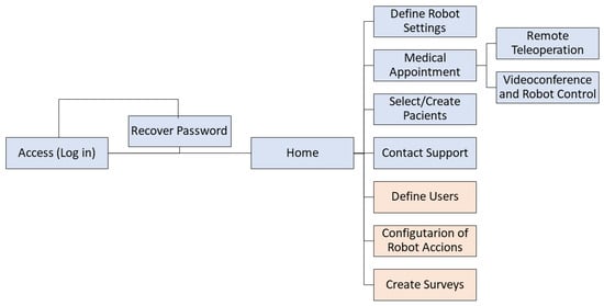 For the proper teleoperation of the robot, it is necessary to design a platform with robust communication that ensures smooth transmission without latency, delays, or failures that may impact the system’s performance [,]. The web platform allows health specialists to control all the functionalities of the robot, including the execution of the therapeutic session. Figure 14 presents the design of the web platform.