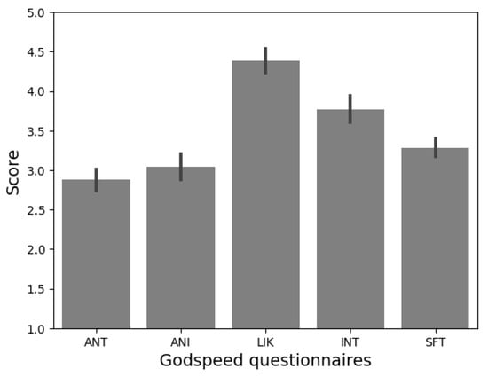 - Weiss, A.; Bartneck, C. Meta analysis of the usage of the Godspeed Questionnaire Series. In Proceedings of the 2015 24th IEEE International Symposium on Robot and Human Interactive Communication (RO-MAN), Kobe, Japan, 31 August–4 September 2015; pp. 381–388. [Google Scholar] [CrossRef]