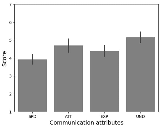 Prior to this study, a preliminary experiment was conducted to evaluate users’ perceptions of Qhali’s attributes and gestures []. Participants were presented with an animated video of Qhali to elicit their responses in the Godspeed Questionnaire and communication attributes scale (see Figure 17). Consistent with the findings from the mentioned study [], participants highlighted the robot’s likeability (M = 4.38, SD = 0.53), perceived intelligence (M = 3.76, SD = 0.6), and perceived safety (M = 3.28, SD = 0.4) as particularly noteworthy, distinguishing them from the other two dimensions of the questionnaire: U (M = 3.08, SD = 0.58) and anthropomorphism (M = 2.87, SD = 0.4).