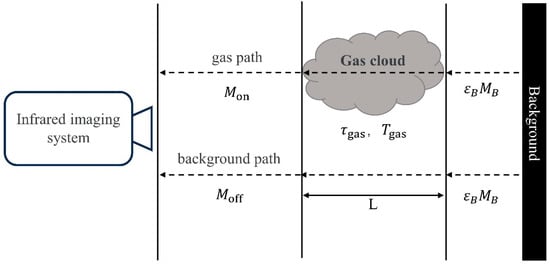 Here, we introduce a simplified radiation transmission model that divides the entire radiation transmission process into three layers, as shown in Figure 1. Layer 1 is the stage before the infrared radiation is absorbed by the gas cloud; layer 2 is the radiation before and when passing through the gas cloud (accounting for the absorption and radiation properties of the gas cloud); and layer 3 is the stage before the infrared radiation reaches the infrared lens of the thermal imager through the gas cloud [28]. The radiation difference in the thermal image originates from the upper and lower paths, as shown in Figure 2. The first path is the path by which the infrared radiation reaches the detector through the gas cloud, and it is called the gas path. The second path is the path by which the background radiation reaches the camera directly, and it is called the background path.