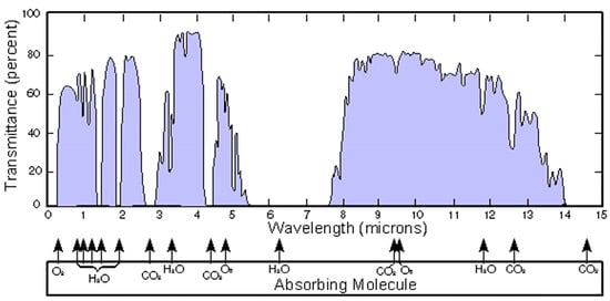 The thermal imager detector will receive three kinds of radiation waves, which are generated by the target gas, the background, and the atmosphere. The atmosphere absorbs both visible light and infrared radiation. However, in the mid-wave infrared (3–5 μm) and long-wave infrared (8–14 μm) bands, the atmosphere has a lower absorbance and thus higher transmittance for the infrared radiation. Within these two wavelength ranges, the atmosphere has a relatively small effect on gas infrared imaging. This wavelength range is also known as the “atmospheric window”. The transmission spectrum of 1828.8 m of air is shown in Figure 3. Within this atmospheric window, specifically in the 7–16 μm wavelength range known as the “fingerprint region” of gases, absorption peaks exhibit high characteristic features [29]. These peaks can be used to discern subtle structural differences between different compounds. Consequently, gas infrared imaging measurements are generally conducted within this atmospheric window band.