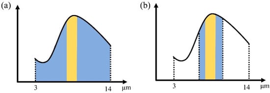 In cases where only one type of gas is detected, and particularly in the case where only one or a few narrow infrared absorption peaks are present, narrowband filters are often used to perform spectral selection. This is largely because of their advantages, which include simple structures and high cost-effectiveness [38]. Using narrowband filters that match the strong absorption bands of the target gases can increase the percentage of the radiation that is absorbed by the detector as a result of gas absorption [39,40]. The proportion of the yellow region shown in Figure 4a is significantly smaller than the corresponding region in Figure 4b. Common gases including NH3, SO2, NO, CH4, and SF6 have narrow absorption peaks in the infrared band and are thus suitable for spectral band selection using a single filter.