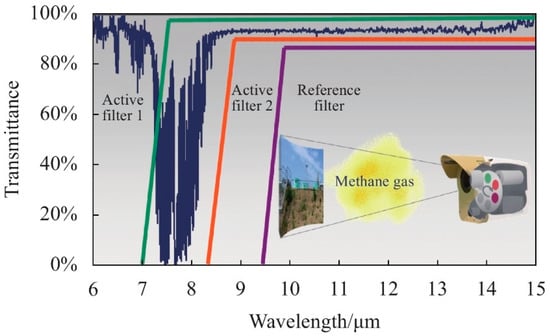 Long-pass filters, which are often used in combination with multiple filters, offer the advantage of the ability to detect a broad range of gases at lower cost. In 1991, the French company Bertin proposed a gas leak infrared imaging detection technology based on differential spectral filtering [55]. Differential spectral imaging technology offers advantages that include a high SNR, a wide spectral range, and high-cost performance. The technique uses two filter types: a reference filter and an active filter. The passband of the reference filter is located outside the target gas absorption range, and the passband of the active filter contains the absorption peaks of the target gas. As illustrated in Figure 7, their technique can extract a target gas via differencing of the IR images obtained using the two neighboring filters, or it can differentiate between different gases with absorption peaks that are close together. Differential infrared imaging detection can reduce the influence of radiation and reflection from the filter itself effectively and can thus improve the sensitivity of uncooled infrared imaging systems.