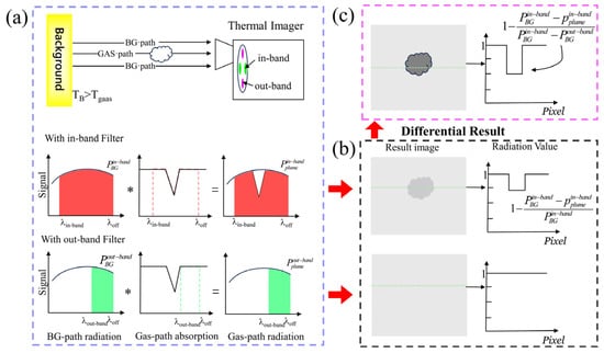 Schematic diagram of the DB–SD gas enhancement method. (a) The top row shows the radiation transfer for DB–SD imaging, and the bottom two rows are the in-band and out-band gas path and the BG path filtered by the IR radiation, respectively.∗ represents the operation of the filter on incident light.(b) the in-band and out-band images and their corresponding normalized grey values; and (c) the DB–SD image obtained by subtracting between the in-band and out-band images.