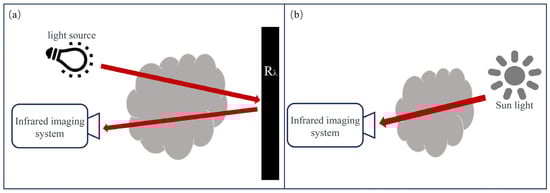Most the research discussed above was conducted in laboratory environment conditions or assumed a blackbody background. That means that there is a thermal contrast between the gas-free cloud region and the gas cloud region, but if the temperature difference between the gas and the background is not large enough to ensure that the temperature difference is less than the NETD of the uncooled thermal imager, the thermal imager will then be unable to image the gas cloud to be measured accurately. In this case, it becomes necessary to illuminate the gas using an external light source to increase the temperature difference between the gas and the background [28], as shown in Figure 9. The light source used can be sunlight or it can be an artificial light source, e.g., low-cost broadband tungsten halogen lamps, narrowband lasers, or light-emitting diodes. In this case, the emitted light should match the energy gap of the gas to be measured [59,60].