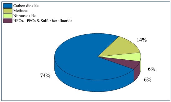 Greenhouse gases (GHGs) refer to the natural and anthropogenic gaseous components in the atmosphere that absorb and re-emit infrared radiation. The GHGs specified in the Kyoto Protocol include CO2, CH4, N2O, hydrofluorocarbons (HFCs), perfluorocarbons (PFCs), and SF6 [78]. According to the World Resources Institute, the current composition of the global emissions of GHGs is as shown in Figure 11. Increases in the presence of GHGs can lead to glacier retreat, rising sea levels, northward shifts of climate zones, and more frequent occurrences of the El Niño phenomenon, and will consequently trigger a series of ecological problems.